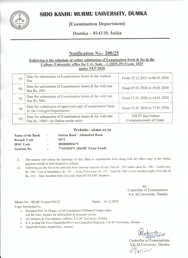 अगर आप Sidho Kanhu Murmu University (SKMU), Dumka से UG Semester-I (Session 2025-29) में पढ़ाई कर रहे हैं, तो यह खबर आपके लिए बहुत जरूरी है। यूनिवर्सिटी के Examination Department की ओर से Notification No. 200/25 जारी कर दी गई है, जिसमें UG Sem-I Examination 2025 के लिए Online Examination Form और Fee Submission Schedule बताया गया है।
